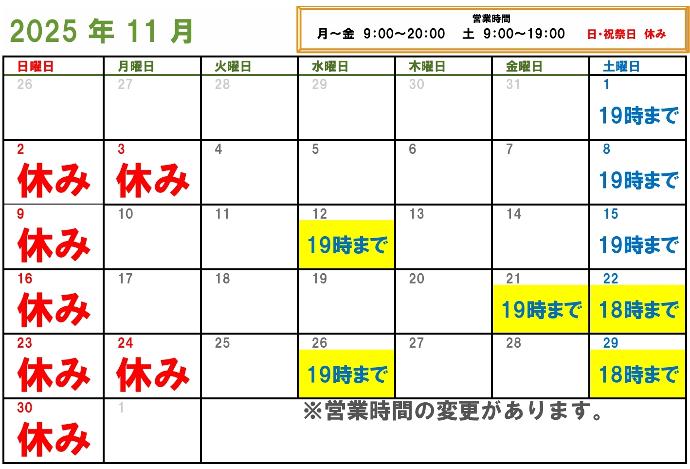 11月の営業カレンダー更新しました!